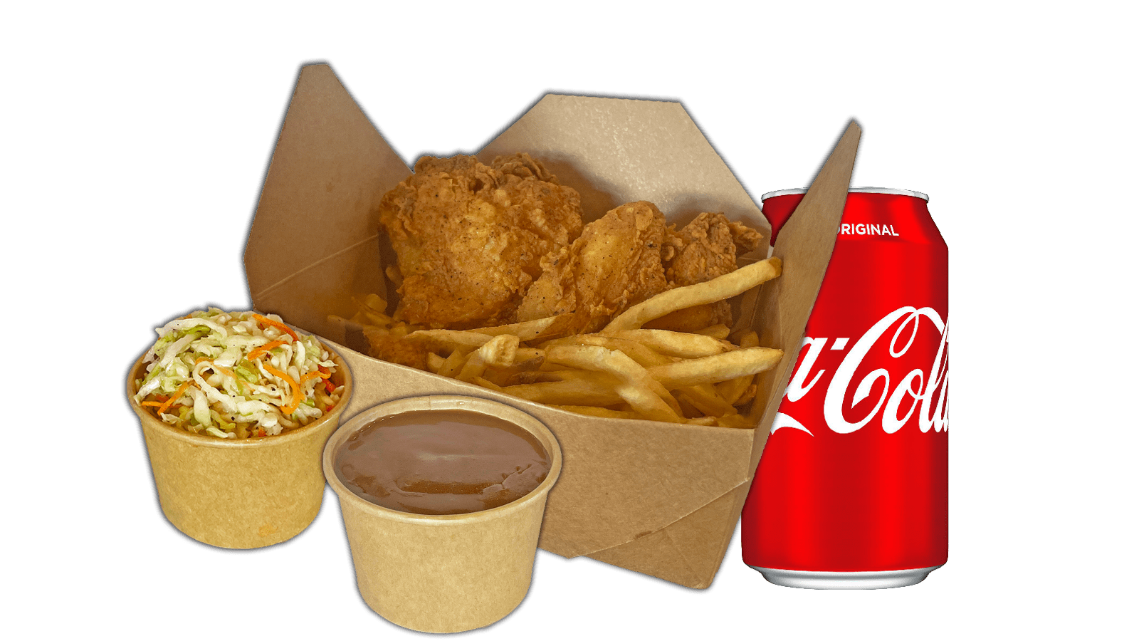 Crispy fried chicken, Southern Georgia style. Seasoned with our secret coating. The best way to get the south in your mouth. Served with fries, coleslaw, gravy and soft drink.